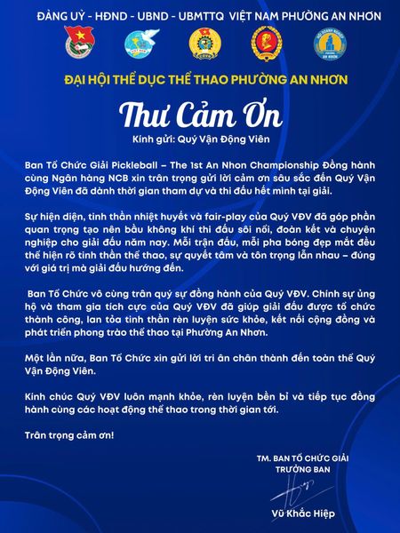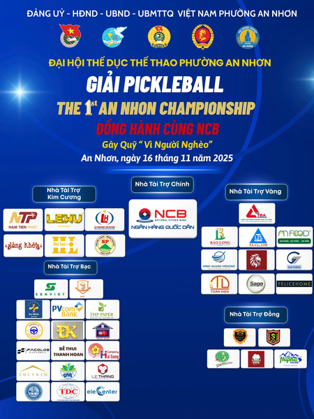 Vào ngày 16/11/2025, đại hội Thể dục Thể thao Phường An Nhơn đã chính thức khai mạc với Giải Pickleball lần đầu tiên mang tên "The 1st An Nhon Championship". Sự kiện thu hút hàng trăm vận động viên, người dân, doanh nghiệp tham gia, không chỉ lan tỏa tinh thần rèn luyện thể thao mà còn mở rộng những giá trị nhân văn thiết thực.
