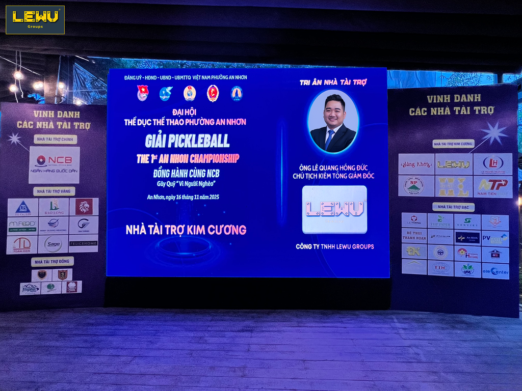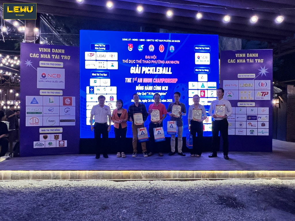 Tại sự kiện, hình ảnh logo LEWU GROUPS nổi bật trên các phông danh dựng, cùng đội ngũ lãnh đạo doanh nghiệp trực tiếp tham gia giao lưu, đóng góp tinh thần và động lòng với công đồng.